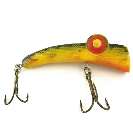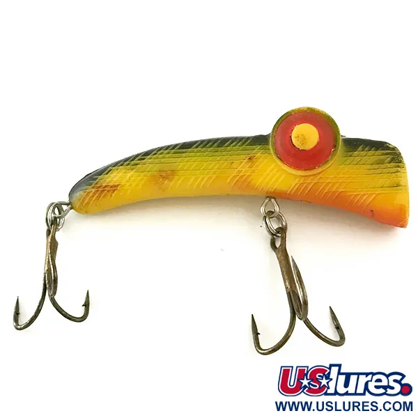 Tento Rabble Rouser, kompletně vyrobený v USA, vyniká svým charakteristickým žlutým, zeleným a červeným provedením. S délkou 6,5 cm (2 1/2") a hmotností 6 g (3/16 oz) je tato nástraha vynikajícím příkladem odvážné estetiky amerického rybářského náčiní z poloviny minulého století. Tělo přechází ze sytě žlutého břicha do strukturovaného zeleného hřbetu, doplněného velkýma koncentrickýma červeno-žlutýma očima, které jsou pro tuto značku typické. Wobler s produktovým kódem 6657 je osazen dvěma trojháčky a určen pro lov na hladině nebo v mělčinách s ponorem do 0,5 m (1,6 ft). Pro sběratele amerického řemesla je stav tohoto kusu výjimečný, s hodnocením 5/5 za skvěle zachovalý lak i osazení. Ať už se používá k přívlači nebo trollingu na štiky a okouny, konstrukce odráží odolnost, kterou byla značka Rabble Rouser Fishing Lures známá. Jemné strukturování na bocích imituje decentní vzor šupin a zachycuje světlo napříč tříbarevným gradientem.