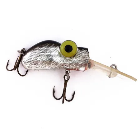 Stříbrné křížové šrafování definuje 4,5 cm (1 3/4") profil tohoto amerického modelu. Rabble Rouser Roo-Tur váží 9 g (1/3 oz) a je vybaven širokou čirou plastovou lopatkou navrženou pro hluboký ponor. Červený detail u kořene lopatky tvoří decentní kontrast k jasně kovovému tělu. Dva bronzové trojháčky jsou upevněny na břiše a vzadu, zatímco naddimenzované žluté oči s černými zornicemi dodávají nástraze její ikonický výraz. Nástraha s produktovým kódem 10278 je ve stavu 5/5, bez jakýchkoli známek použití na reflexních površích. Mřížková textura na bocích napodobuje komplexní šupinový vzor a vyzdvihuje osobitý výrobní styl americké produkce Rabble Rouser.