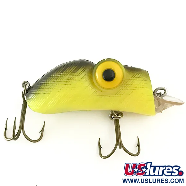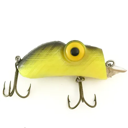 Žluté a černé křížové šrafování na hřbetu okamžitě identifikuje tento Rabble Rouser Rouster jako výrazný příklad americké historie rybářského náčiní. Tento model 6658 o délce 5,5 cm (2 1/4") a hmotnosti 13 g (1/2 oz) je určen pro přívlač i trolling. Předimenzované žluté oči s vycentrovanými černými zorničkami dodávají nástraze charakteristický vypoulený vzhled, který sběratelé u této značky poznávají. Jako hlučný, plovoucí exemplář je schopen při navíjení dosáhnout hloubky 3,5 m (11,5 ft). Čirá, stupňovitá potápivá lopatka a dva trojháčky jsou ve vynikajícím stavu, což odpovídá hodnocení kondice 5/5. Protože všechny nástrahy tohoto výrobce byly vyráběny výhradně v USA, zpracování si zachovává robustní kvalitu vhodnou pro lov štik nebo candátů.
