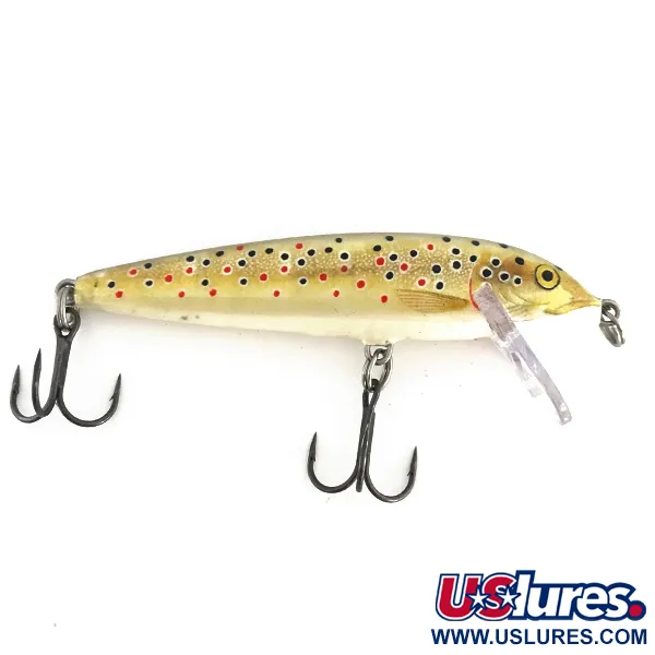 S váhou 12 g (2/5 oz) představuje barva TR na tomto modelu Rapala Countdown S9 klasický vzor pstruha potočního s výraznými červenými a černými tečkami na zlatém podkladu. Balzové tělo o délce 9 cm (3 1/2") je navrženo pro kontrolované potápění, což umožňuje přesné vedení v hloubce mezi 0,3 a 3,9 m (1 ft - 12,8 ft). Tento exemplář vyrobený v Estonsku, vedený pod kódem 8530, má hodnocení stavu 5/5, což značí, že byl skvěle zachován s čistým povrchem. Pro ty, kteří cílí na druhy jako losos, pstruh nebo candát, nabízí potápivé provedení výhodu při nahazování i trollingu. Čiré nořítko je správně nastaveno pro určený rozsah hloubek a originální trojháčky zůstávají ostré. Detaily zlatých šupin na bocích poskytují přirozené odlesky, které doplňují tmavší tečkování na hřbetě.
