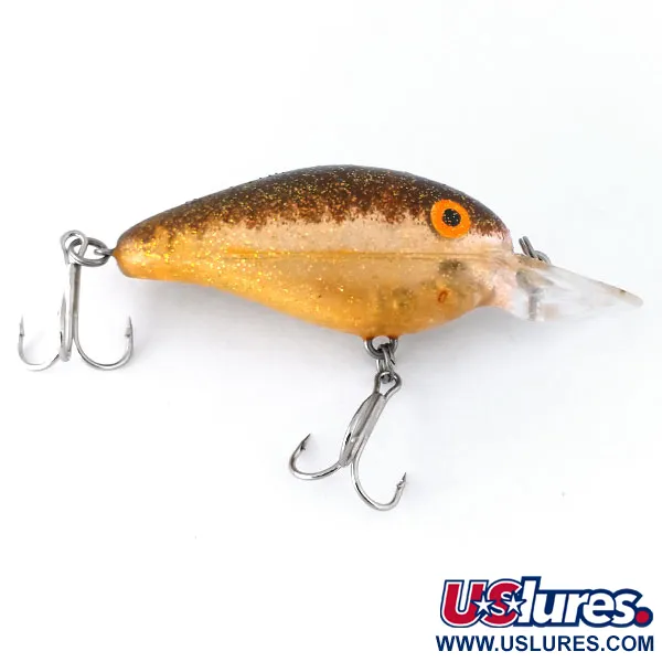 Tělo této 10g (1/3 oz) nástrahy v tmavě hnědém provedení přes zlaté třpytky efektivně odráží světlo pod hladinou. Tento Rebel Crank R s produktovým kódem 10415 měří 5 cm (2") a je ve výjimečném stavu 5/5. Průsvitné žlutozlaté boky jsou hustě pokryty kovovými třpytkami, zatímco hřbet má tmavý, zemitě hnědý nátěr. Široká, čirá plastová lopatka umožňuje nástraze pracovat v hloubkovém rozsahu 0,9 až 1,6 m (3 až 5,2 ft), což z ní činí spolehlivou volbu pro lov v překážkách ve středních hloubkách. Výbavu tvoří dva stříbrné trojháčky upevněné nerezovými kroužky. Výrazné oranžové oko slouží jako vysoce kontrastní bod útoku proti tmavší hlavě. Tento plovoucí model je konstruován jak pro přívlač, tak pro trolling.