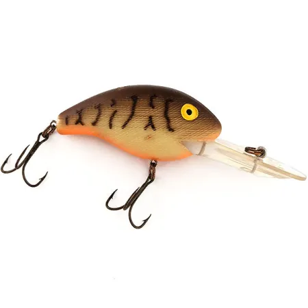 S váhou 28 g (1 oz) představuje tento masivní Deep Maxi R přístup značky Rebel z 80. let k lovu trofejních štik v hlubších vodách. Povrchová úprava Brown Tiger se vyznačuje temně čokoládovým hřbetem, který přechází do texturovaného, křížově šrafovaného vzoru šupin na krémových bocích, zdůrazněného výraznými vertikálními tygřími pruhy. Oranžově tónované břicho poskytuje klasický kontrast a přechází v nadsazenou čirou potápivou lopatku. Tato lopatka, opatřená značkou výrobce a osazená robustním kroužkem, je navržena tak, aby při nahazování nebo trollingu dosáhla hloubky 3,0 m (9,8 ft) i více. Výrazné žluté oči s tmavými zornicemi mu dodávají nezaměnitelný klasický vzhled Rebel, charakteristický pro americké řemeslo té doby. Veškerý hardware, včetně dvou silných trojháčků, zůstává v prvotřídním stavu, což odpovídá hodnocení 5/5. Tento konkrétní exemplář, katalogizovaný pod kódem 12867, ukazuje odolné odlévané tělo, díky kterému se tyto nástrahy staly základem výbavy pro hlubinný rybolov.