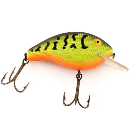 Vzor Fire Tiger s vysoce kontrastními přechody neonově žluté a oranžové barvy činí z tohoto 6,5cm (2 1/2") wobleru nepřehlédnutelnou nástrahu. Rebel Mini R, identifikovaný pod kódem 12868, se vyznačuje strukturovaným povrchem těla, který odráží světlo pod tmavě olivovým hřbetem s výrazným černým svislým žíháním. Čirá lopatka čtvercového tvaru je opatřena klasickým logem Rebel a je navržena pro dosažení hloubek mezi 0,4 m (1,3 ft) a 1,2 m (3,9 ft). Tento exemplář o hmotnosti 17 g (3/5 oz) je sběratelským úlovkem v kondici 5/5, přičemž si zachovává zářivý tovární lak i původní osazení. Ať už se používá k přívlači nebo trollingu, nástraha se ve vodním sloupci chová jako vznášivá (suspender). Břicho u hrdla přechází do sytě oranžového odstínu, zatímco žluté oči s černými zornicemi tvoří jasný bod pro útok dravce. Oba trojháčky zůstávají ve vynikajícím stavu, bez jakýchkoli známek používání nebo opotřebení hrotů.