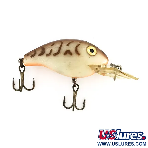 Krémové tělo této nástrahy zdobí výrazný vzor Brown Tiger s odvážnými hnědými pruhy přes hřbet a boky. Tento Rebel Shallow Fastrac s produktovým kódem 8161 byl vyroben v USA a váží univerzálních 9 g (1/3 oz). Jeho profil měří 5,5 cm (2 1/4") a je vybaven nápadnýma zlatýma prismatickýma očima, která odrážejí světlo z různých úhlů. Čiré plastové nořítko je navrženo pro pracovní hloubku mezi 0,6 a 1,8 m a je speciálně úhlováno pro techniky v mělkých vodách, jako je přívlač nebo trolling v blízkosti vázek. Výbava zahrnuje dva bronzové trojháčky a tento kus vykazuje vynikající stav 5/5. Břicho přechází z pruhovaných boků do měkkého perleťového lesku, který je typický pro vintage produkci Rebel z této éry.