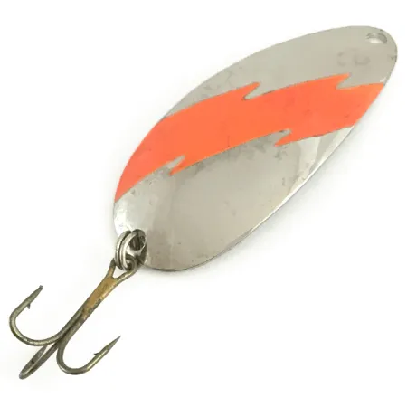 Poniklování poskytuje klasický vysoce lesklý základ této 10,5 g (3/8 oz) plandavce, která se vyznačuje výrazným vzorem blesku ve fluorescenční oranžové barvě na své konvexní straně. Plandavka Red Eye (kód produktu 6626) o délce 6 cm (2 1/4") vykazuje preciznost výroby v USA, přičemž název značky Red Eye Lures je jasně vyražen do konkávní vnitřní části. Tento konkrétní exemplář pro trolling je ve stavu 5/5, zachovává si jasný, reflexní povrch a výrazný pigment bez výrazného opotřebení. Výbava se skládá z robustního trojháčku zajištěného vysoce odolným kroužkem, navrženým tak, aby odolal tlakům při hlubinném trollingu. Čistě vyvrtaný upevňovací bod na špičce umožňuje přímé navázání vlasce nebo použití karabinky, čímž zůstává zachován aerodynamický profil nástrahy.