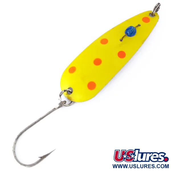 Žlutý lak a výrazné červené tečky pokrývají 7,5cm (3") tělo této plandavky Eppinger Red Eye Evil Eye UV. Tato nástraha, vedená pod kódem produktu 10496, je vybavena ikonickým modrým skleněným korálkem místo „oka“, který je upevněn ve středu těla. Zatímco za denního světla působí jasně žlutě, povrchová úprava je navržena tak, aby při vystavení UV záření zářila luminiscenční zelenou barvou, což je technický detail určený ke zvýšení viditelnosti v hlubších vrstvách vody. Výbava se skládá z jednoho jednoháčku s velkým obloučkem a robustního kroužku, navrženého speciálně pro trolling. Tento exemplář je ve stavu 5/5, se zachovalým hladkým povrchem a čirým skleněným korálkem. Hmotnost 6g (3/16oz) dodává kompaktnímu profilu nástrahy solidní váhu.