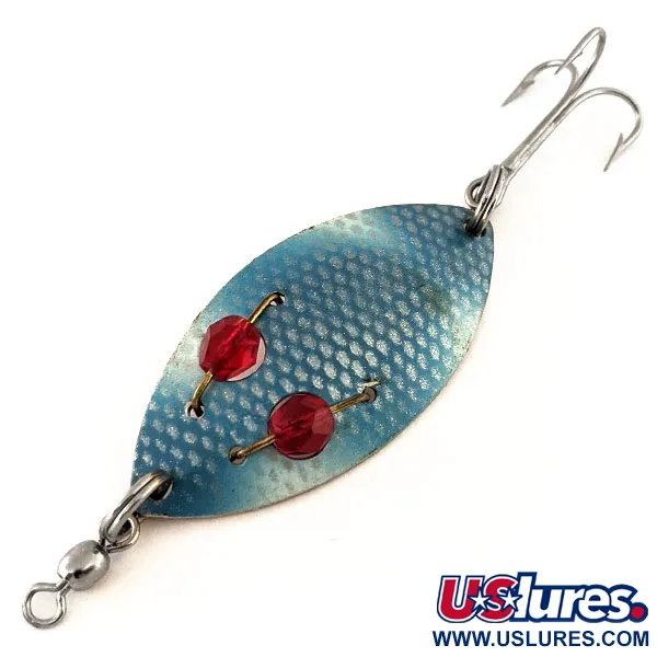 Broušené červené skleněné korálky jsou pevně vdrátovány do těla plandavky a slouží jako ikonické body útoku, podle kterých dostala Hofschneider Red Eye Junior své jméno. S délkou 5,5 cm (2 1/4") a hmotností 11 g (2/5 oz) se tato konkrétní nástraha pod kódem 11330 vyznačuje zářivým vzorem modrých šupin na stříbrném podkladu. Zadní strana plandavky je z leštěného niklu, opatřená jasnou značkou výrobce z Rochesteru v NY. Rybáři na tento klasický tvar často spoléhají při pomalém vedení, což z něj činí základní nástrahu pro lov štik a okounů v teplejších vodách. Osazení tvoří robustní hlavový obratlík a lesklý trojháček na konci. Nástraha je ve stavu 5/5 a zachovává si svůj původní lesk jak na lakované straně se šupinami, tak na kovové spodní části.