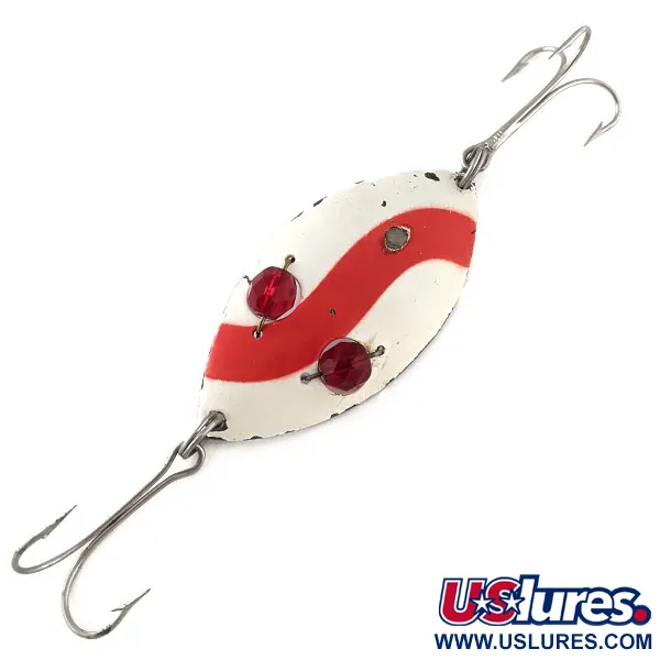 Diagonální červené pruhy na bílém podkladu charakterizují povrchovou úpravu této v USA vyrobené plandavky, která zajišťuje vysokou viditelnost v různých vodních podmínkách. Tato plandavka Hofschneider Red Eye Wiggler (kód produktu: 11541) o hmotnosti 25 g (1 oz) a délce 7,5 cm (3") je osazena ikonickými broušenými červenými skleněnými korálky zasazenými do kovového těla. Tyto „oči“ jsou navrženy tak, aby zachycovaly a odrážely světlo, což je charakteristický prvek, díky němuž se tento model stal od poloviny 20. století klasikou pro lov štik a okounů. Zadní strana nástrahy je v bílém provedení a zřetelně nese vyražený název „RED EYE WIGGLER“ spolu se značkou výrobce. Osazení dvěma trojháčky zajištěnými robustními kroužky zaručuje odolnost při přívlači i trollingu. Tento exemplář je ve stavu 4/5, vykazuje lehkou ztrátu barvy na hranách a určité opotřebení kovových částí, což odráží jeho historii funkčního nástroje pro techniky pomalého vedení, pro které byl navržen.