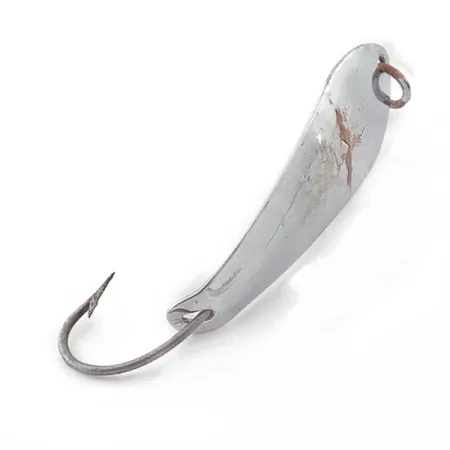 Niklování pokrývá 4,5 cm (1 3/4") tělo této vintage plandavky, která vykazuje známky používání odpovídající hodnocení stavu 3/5. Kovové tělo o hmotnosti 4,5 g (3/16 oz) je opatřeno raženým značením výrobce, které potvrzuje, že se jedná o model Barracuda Reflecto #1 s kódem produktu 23565. Tento exemplář vyrobený v USA je osazen jednoháčkem připevněným pomocí kroužku v zadní části, což představuje robustní sestavu určenou pro nahazování nebo trolling. Na horní straně poblíž očka pro vlasec jsou patrné stopy oxidace, ačkoli původní kovový lesk zůstává na zbytku těla dominantní. V hlavové části je namontován jeden kroužek pro spolehlivé upevnění vlasce.