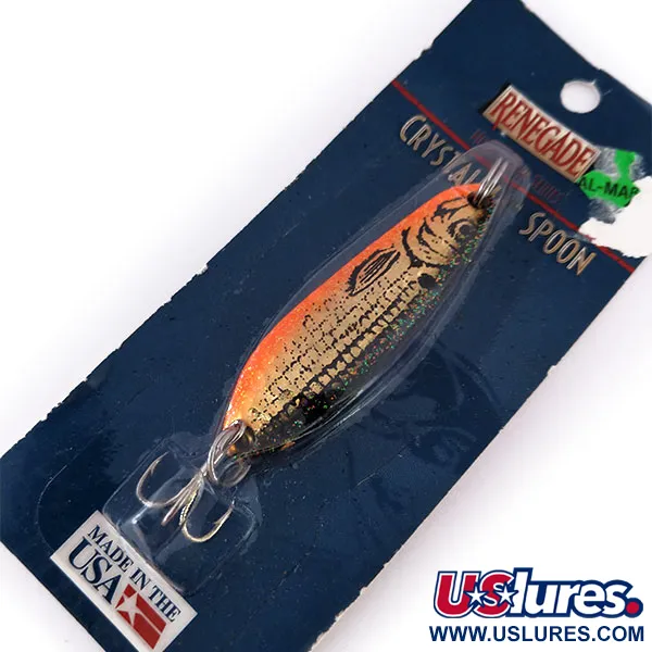 Plandavka Renegade Crystalina Spoon o hmotnosti 11 g je vybavena fasetovaným „voštinovým“ povrchem, který je navržen tak, aby vytvářel mnohostranné odlesky. Tento nepoužitý kus s kódem produktu 12348 má povrchovou úpravu v barvě tepaného zlata a oranžové s černým potiskem rybího vzoru po straně. Nástraha o délce 5,5 cm je osazena stříbrným trojháčkem a vysoce odolným kroužkem. Řada Crystalina byla vyrobena v USA, konkrétně v Indianě v Pensylvánii, a byla uváděna na trh jako specializovaný nástroj pro lov pstruhů a dalších dravých ryb. Výrazný oranžový pruh podél hřbetu přechází do jasně zlaté tepané textury, která má napodobovat šupiny a vizuální profil nástražní rybky.