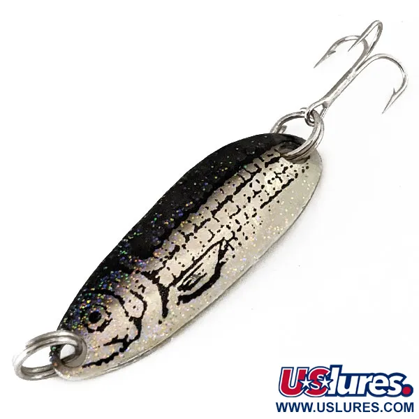 Plandavka Renegade Crystalina Spoon - Honeycomb Series o délce 4 cm (1 1/2") se vyznačuje výrazným vzorem Minnow, kde se třpytivý černý hřbet setkává se stříbrným základem s potiskem rybí hlavy a šupin. Tato 7g (1/4 oz) plandavka nese kód produktu 11188 a je osazena odolnými kroužky a ostrým trojháčkem. Zadní strana plandavky je v čistém, leštěném stříbře, což vytváří jasný kontrast k vzorované přední straně. Stav tohoto kusu je hodnocen 5/5, povrchová úprava i osazení jsou v bezvadném stavu.