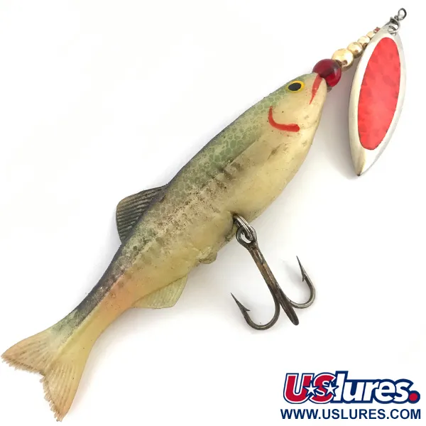 Zelené a červené tóny definují vizuální profil tohoto 40g (1 1/3 oz) exempláře s produktovým kódem 4520 z řady Renosky Lures. S celkovou délkou 17 cm (6 3/4") je nástraha konstruována s měkkým, realistickým tělem, které vykazuje přirozený přechod z olivově zeleného hřbetu k bledému, krémovému břichu. U hlavy je umístěn rotační list typu vrbový list s výraznou červenou vložkou, namontovaný vedle řady zlatavých korálků a jednoho červeného ohniska. Břicho je vybaveno robustním, dobře zachovalým trojhákem upevněným k vnitřnímu drátěnému rámu. Sběratelé ocení ručně malované detaily, včetně žluto-černého oka a jasně červené linie žaber. Samotné tělo vykazuje jemné vertikální značení a texturované detaily ploutví, přičemž si zachovává velmi vysokou kvalitu odpovídající hodnocení stavu 5/5. Řemeslné zpracování tohoto specifického modelu Renosky z USA zdůrazňuje integraci vysoce lesklých komponentů s texturovaným profilem z měkkého plastu.