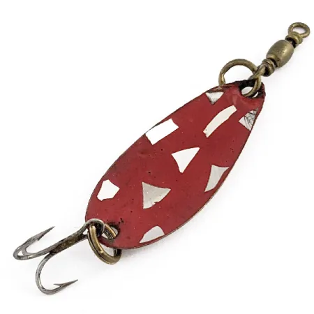 Červený lak nanesený na niklovém základě definuje vizuální charakter této vzácné třpytky o hmotnosti 1,5 g (3/64 oz), sběratelům známé jako Roy Self #1. Povrchová úprava obsahuje rozptýlené geometrické niklové vločky, které narušují červený povrch, což je klasický designový prvek Roy Self zaměřený na vytváření světelných odlesků. Tento konkrétní exemplář s produktovým kódem 23043 měří kompaktních 3,3 cm (1 1/4") a představuje skvělý příklad řemeslného zpracování historických plandavek. V hlavové i ocasní části jsou osazeny kroužky v mosazném tónu, přičemž horní kroužek nese obratlík a spodní je osazen trojháčkem. Nástraha je ve vynikajícím stavu, s dobře zachovalou povrchovou úpravou i hardwarem, což odpovídá hodnocení stavu 5/5. Niklový povrch na zadní straně je lesklý a odpovídá vysoce kvalitnímu pokovení typickému pro výrobu rybářského náčiní z poloviny minulého století.