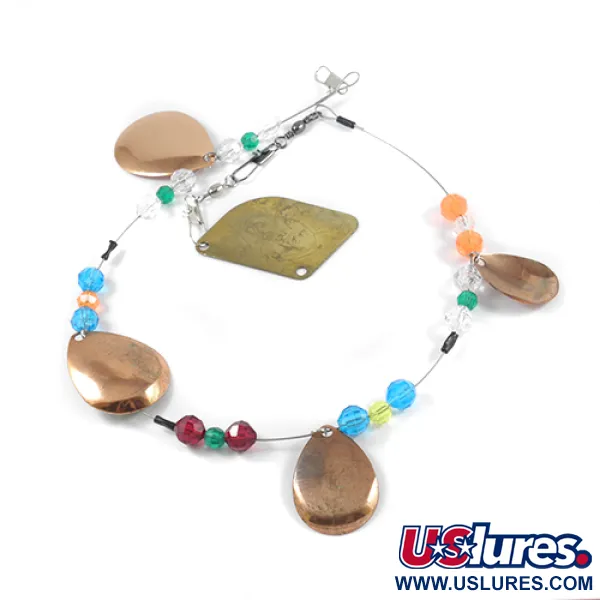Čtyři měděné lístky ve tvaru kapky jsou strategicky rozmístěny na drátěném rámu této klasické trollingové vábničky vyrobené v USA. Tento systém od SEP'S (kód 2399) měří 50 cm a obsahuje broušené plastové korálky v barvách smaragdově zelené, nebesky modré, jantarové a čiré. Centrální mosazná stabilizační destička s logem výrobce zajišťuje rovnováhu celého 24g návazce. Sestava využívá kvalitní obratlíky a karabinky pro hlubinný trolling. S mírnými známkami používání jsou kovové povrchy i drát ve výborném stavu (hodnocení 4/5). Všech čtyři lístky si zachovávají jasný, reflexní povrch, který doplňuje barevné korálky.