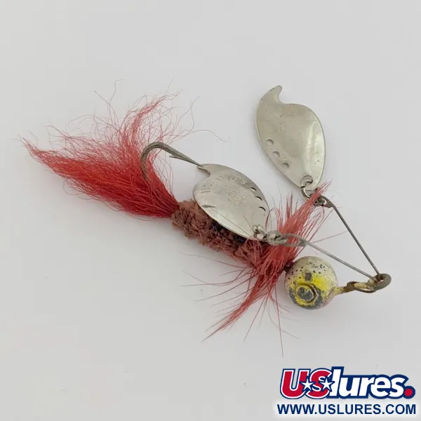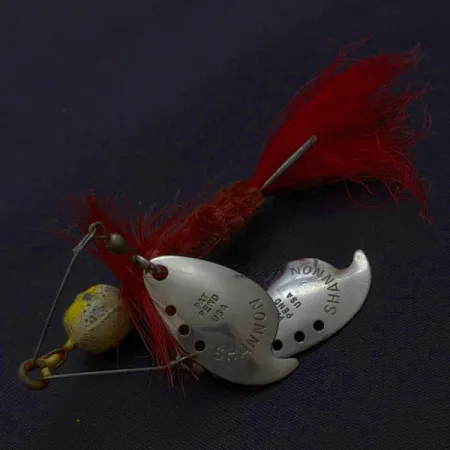 Přímo do niklových lístků jsou vyraženy značky „SHANNON“ a „PAT PEND USA“, což je charakteristický znak designu Jamison vyráběného od 20. do 40. let 20. století. Tento 5cm Shannon Twin Spinner kombinuje dvojité lístky s výrazně červeným peřím a strukturovaným hnědým žinylkovým tělem. Olověná hlavička o hmotnosti 10 g nese stopy času v podobě původního žluto-černého nátěru (stav 4/5). Drátěný rám umísťuje rotační lístky nad tělo nástrahy, což je konstrukce určená pro lov v hustých porostech nebo vázkách. Červené peří zůstává pozoruhodně husté a jasné, což vytváří ostrý kontrast k niklovému povrchu lístků. Model #24491 představuje ranou inovaci v designu nezaplevelujících nástrah.