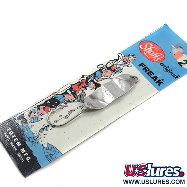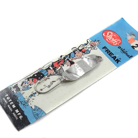 Na reflexním stříbrném listu je jasně vyraženo číslo „2“ spolu s názvem modelu „FREAK“, což identifikuje tuto klasickou plandavku ze severozápadu. Tato 5,5 cm (2 1/4") nástraha, vyrobená pod značkou Shoff's a distribuovaná společností Totem Mfg. v Kentu ve státě Washington, vykazuje kvalitní řemeslné zpracování historického amerického náčiní. Stříbření je výjimečně čisté, protože položka je nepoužitá a zachovává si svůj původní lesk bez jakýchkoli známek stáří nebo opotřebení skladováním. List o hmotnosti 12 g (2/5 oz) je spojen s robustním jednoháčkem navrženým pro bezpečný zásek. Originální prodejní karta obsahuje okouzlující ilustrace rybářů z poloviny století, které dodávají historický charakter produktu s kódem 1885. Její výrazný tvar a reliéfní povrch jsou charakteristickými znaky designu určeného pro přívlač nebo trolling v různých vodních podmínkách.