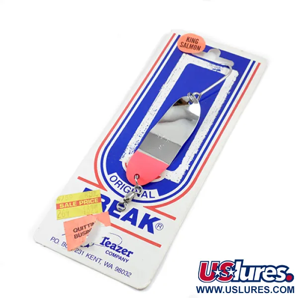 Matně červená/růžová špička vytváří ostrý vizuální kontrast k vysoce leštěnému niklovému tělu této plandavky Shoff's Freak 3. Nástraha o hmotnosti 9 g (1/3 oz) se vyznačuje výrazným profilem s křivkou ve tvaru „S“ a na zadní straně je opatřena ražbou „3“ pro označení velikosti. Tento konkrétní model, vyrobený společností Teazer Company z Kentu ve státě Washington pod kódem produktu 1893, byl původně určen pro lov lososa čavyča. Při délce 7 cm (2 3/4") tvoří výbavu vpředu namontovaný válečkový obratlík a průběžná drátěná konstrukce navržená pro plynulé přitahování nebo trolling. Zatímco originální kartonový obal vykazuje určité opotřebení a natržení v blízkosti historických cenovek, samotná nástraha je nepoužitá.
