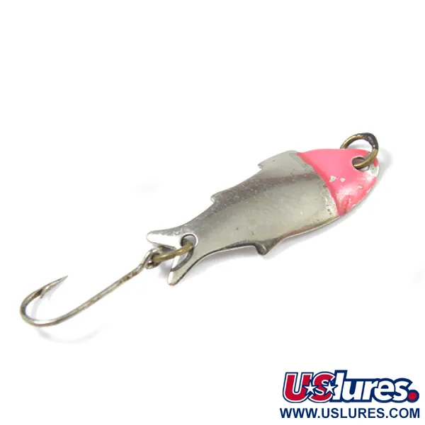 Název Triple Teazer, vyražený přímo do kovu na spodní straně, identifikuje tuto klasickou americkou plandavku od společnosti Shoff's. Tato malá nástraha o délce pouhé 3 cm (1 1/4") a delikátní hmotnosti 1,1 g (1/32 oz) byla navržena pro lehkou a ultra-light přívlač. Poniklované tělo má siluetu s profilem ryby, doplněnou výraznou hřbetní ploutví a rozeklaným ocasem. Zářivě červená barva na hlavové části u očka pro vlasec slouží jako vizualní spouštěč pro ryby v okolí. Jednoháček, připevněný pomocí kroužku v zadní části, zůstává čistý a ostrý. Tento exemplář vyrobený v USA nese kód produktu 2171 a vykazuje mírné známky používání, což mu vyneslo solidní hodnocení stavu 4/5. Pokovení si zachovává velkou část svého původního lesku a jasně zvýrazňuje vyražený text, který připomíná odkaz značky Shoff's v rybářské komunitě pacifického severozápadu.