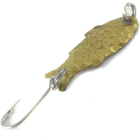 Povrch z tepané mosazi dodává této vintage plandavce výrazný šupinatý vzhled, díky kterému v čisté vodě věrně imituje drobnou potravu. Shoff's Triple Teazer o délce 3 cm (1 1/4") a hmotnosti 1,1 g (1/32 oz) představuje ultralehkou klasiku z USA. Tento konkrétní kus s kódem produktu 4099 zůstává ve stavu 4/5 s čistým povrchem a jasně vyraženými ploutvemi podél okrajů těla ve tvaru rybky. Je osazen stříbrnými kroužky v přední i zadní části a jedním ostrým háčkem. Silueta napodobuje malou střevli, včetně zužujícího se ocasu a mírně širší hlavy. Tepaná úprava na přední straně vytváří mnohočetné odlesky světla, zatímco konkávní zadní strana zůstává hladká a nechává vyniknout původní barvu mosazi.