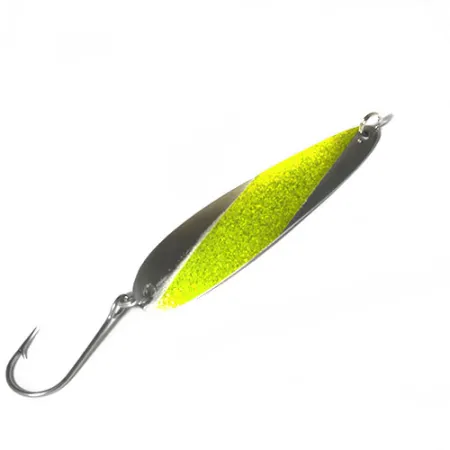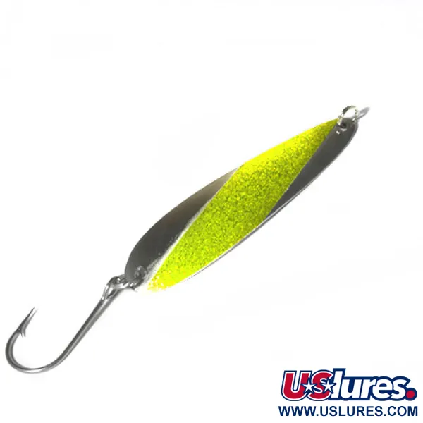 Tato plandavka Slammer o hmotnosti 11,5 g (2/5 oz) se vyznačuje výrazným diagonálním zlato-třpytivým pruhem na leštěném niklovém těle. Tento 9,5 cm (3 3/4") specialista na trolling pochází z USA a na čisté niklové zadní straně má vyražené jméno výrobce. Model 0480 je uzpůsoben pro náročné nasazení s jedním robustním háčkem připevněným přes pevný kroužek, což je sestava oblíbená rybáři na Velkých jezerech a pobřežích pro lov druhů se silnými čelistmi. Povrchová úprava poskytuje vysoce kontrastní záblesk, kombinující odrazivost niklu s texturovaným třpytem zlato-chartreuse akcentu. Při hodnocení stavu 4/5 si kovové povrchy zachovávají svůj původní lesk a hardware zůstává pevný a funkční. Prodloužený, štíhlý profil Slammer 0480, navržený speciálně pro stabilní tempo trollingu, je tvarován tak, aby se pohyboval stabilně při různých rychlostech.