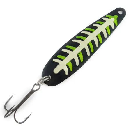 Matně černý povrch tvoří základ pro luminiscenční vzor kostry na této plandavce o hmotnosti 8,5 g (1/3 oz). Model Slammer Glow (kód produktu 22551), vyrobený v USA, využívá vysoce kontrastní zeleno-bílé barevné schéma svítící ve tmě. Kovové tělo o délce 8,5 cm (3 1/4") je ve stavu 5/5, přičemž lakované detaily jsou ostré a neporušené. Na zadní straně je nástraha opatřena souvislou krémově bílou svítící vrstvou pro viditelnost v hloubkách nebo zakalené vodě. Jeden kroužek spojuje trojháček s tmavou povrchovou úpravou s koncovou částí, zatímco zúžená hlava má otvor pro karabinku nebo návazec. Přechody barev mezi neonově zelenými prvky a bílou strukturou kostry jsou na celém povrchu nástrahy precizně zpracované.