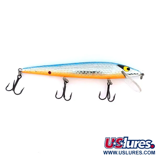 Třpytivé stříbrné šupiny pokrývají boky tohoto 12cm jerkbaitu, které na hřbetě přecházejí do sytě modré a na břiše do jasně oranžové barvy. Tento Smithwick Suspending Rattlin’ Rogue 12, známý pod kódem 11035, je klasickým příkladem amerického řemesla, vyrobeným v USA. Hlavu zdobí výrazné žluté oko v černé slze, což je charakteristický vizuální prvek tohoto modelu. Malá červená tečka umístěná těsně nad spodním bodem u ocasního trojháčku dodává metalickému povrchu jemný detail. Jako vznášivý (suspending) model je tento 12g vobler navržen tak, aby při zastavení navíjení zůstal stát ve vodním sloupci. Vnitřní chrastící komora poskytuje specifický zvukový projev. V závislosti na technice umožňuje čiré plastové lopatko hloubku ponoru 0,3 m až 2 m při nahazování, zatímco při trollingu může nástraha klesnout do 3 m až 4 m. Tento kus je ve stavu 5/5, má čistý lak a tři ostré trojháčky připevněné originálními kroužky.