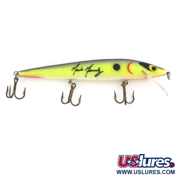 Boky v barvě chartreuse doplněné hluboce fialovým hřbetem definují barevnou paletu tohoto 12 cm (4 3/4") jerkbaitu. Tento Smithwick Suspending Rattlin’ Rogue s produktovým kódem 8404 je edice Mark Menendez, s podpisem profesionálního rybáře na boku. S hmotností 12 g (2/5 oz) je nástraha navržena pro konkrétní hloubky: při nahazování dosahuje 0,3 m až 2 m (1 ft - 6,5 ft) a při trollingu se potápí mezi 3 m a 4 m (10 ft - 13 ft). Pozoruhodnou vlastností tohoto kusu je jeho luminiscence; za slabého osvětlení tělo vydává silnou zelenou záři, zatímco charakteristická černá tečka na rameni a červený oblouk žaber zůstávají jasně viditelné. Vnitřní chrastící komora zajišťuje akustický projev během navíjení. Na spodní straně jsou upevněny tři ostré trojháčky a čirá potápěcí lopatka je pevně na svém místě. Tato americká klasika je zachována ve stavu 5/5, vykazuje čistý povrch a zářivý lak, který se očekává od vysoce kvalitního sběratelského kusu.