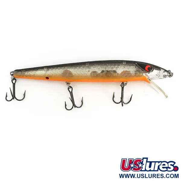 Stříbrné a oranžové akcenty zdobí průsvitné boky se šupinami tohoto Smithwick Suspending Rattlin’ Rogue, což je významný design z jejich výrobní linky v USA. Tento exemplář s produktovým kódem 9037 váží 10 g (1/3 oz), měří 11,5 cm (4 1/2") a je vybaven vnitřní chrastící komorou, která při navíjení vydává zvukový signál. Jako vznášivý (suspending) model je navržen tak, aby při zastavení udržoval svou hloubku, přičemž při nahazování dosahuje 0,3 m - 2 m (1 ft - 6,5 ft) a při trollingu 3 m - 4 m (10 ft - 13 ft). Vizuální profil definuje tmavý hřbet, červeno-černé oči a zářivě oranžové břicho, které poskytuje vysoce kontrastní cíl pro ryby útočící zespodu. Tři ostré trojháčky jsou připevněny pomocí robustních kroužků. Nástraha nevykazuje žádné známky používání, s hodnocením stavu 5/5. Tato konkrétní nástraha je klasickou volbou typu jerkbait pro technickou prezentaci, kde je vyžadována statická pauza ve vodním sloupci.