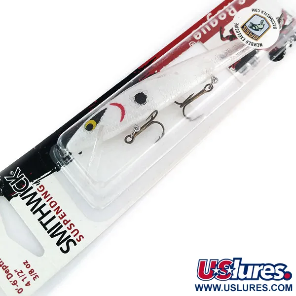 Průhledné bílé šupiny v kombinaci s výraznou červenou žaberní čarou a nápadnou černou boční skvrnou definují vzhled tohoto wobleru Smithwick Suspending Rattlin’ Rogue. Tento jerkbait vyrobený v USA měří 11,4 cm, váží 10,6 g a nese produktový kód 9808. Tento konkrétní kus je nepoužitý, se zachovalým původním továrním lakem a ostrými bronzovými trojháčky. Konstrukce „Pro Rogue“ je vyvážena tak, aby byla vznášivá (suspending) ve vodním sloupci. Při nahazování dosahuje hloubky 0–1,8 m a při trollingu až 3,0–4,0 m. Vnitřní zvukový systém s kuličkami dodává prezentaci technický akustický prvek. Průhledná lopatka je integrovaná do těla, což zajišťuje udržení hloubkového profilu při plynulém navíjení i během pauz.