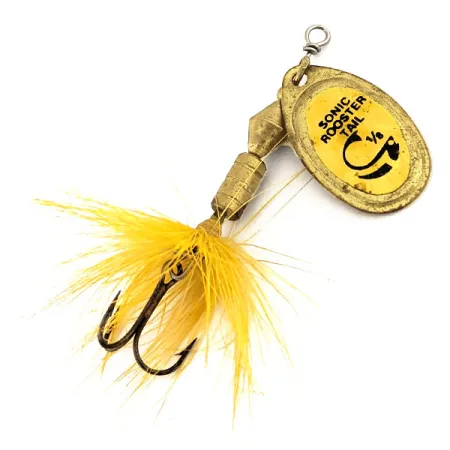 Zářivě žlutý ocas z peří zdobí tuto klasiku od Yakima Bait, jejíž designové dědictví sahá až k inovacím Howarda Wordena z 50. let minulého století. Nástraha o hmotnosti 3/16 oz (5 g) a délce 2 1/4" (5,5 cm) je vybavena rotačním listem ve tvaru vrbového listu s raženým nápisem „SONIC ROOSTER TAIL“. Segmentované kovové tělo má hřejivý mosazný povrch a je zakončeno ostrým trojháčkem, který je dobře chráněn hustými žlutými vlákny. Tento konkrétní kus s produktovým kódem 12614 je ve stavu 5/5 a vykazuje jasný a čistý vzhled všech součástí. Je konstruován pro styl vedení založený na široké rotaci listu, která vytváří vibrace ve vodním sloupci. Jemný dopad opeřené zadní části na hladinu z něj činí historicky oblíbenou volbu pro rybáře na malých, prochytávaných pstruhových potocích, kde je nenápadnost prvořadá.