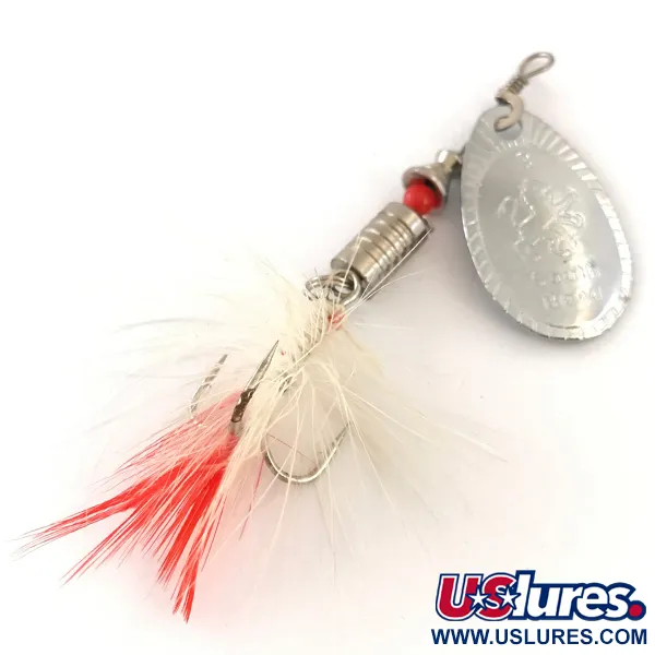 Váha 7 g (1/4 oz) zajišťuje potřebné zatížení pro tuto v Americe vyrobenou nástrahu South Bend 3, což z ní činí spolehlivou volbu pro daleké nahazování. Lesklý niklový povrch pokrývá list oválného tvaru, který je jasně ražen insignií výrobce. Nad zatíženým, žebrovaným kovovým tělískem slouží malý červený korálek jako distanční prvek a bod vizuálního kontrastu. Na konci této 7 cm (2 3/4") dlouhé třpytky se nachází trojháček odborně navázaný přírodním bílým peřím s nádechem červené u ramínka. Pod kódem 4184 je tato třpytka ve stavu 5/5, bez známek předchozího použití. Niklování na listu i součástech tělíska si zachovává svůj původní lesk, charakteristický pro standardy výroby South Bend z poloviny minulého století.