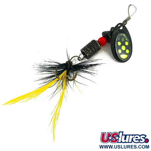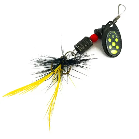 Žluté tečky uspořádané do výrazného kruhového vzoru na sytě černém listu okamžitě signalizují původ této rotačky South Bend. Tento model 5059 pocházející z USA je vybaven trojháčkem zdobeným směsí černého a žlutého peří pro zvětšení profilu a zlepšení pohybu. Nástraha váží 1/8 oz (4 g) a má celkovou délku 2 1/4" (5,5 cm), což z ní činí univerzální volbu pro nahazování v malých potocích nebo jezerech. Vroubkované kovové tělo a jeden červený korálek zajišťují potřebnou váhu a klasický vizuální spouštěč typický pro vintage americký design nářadí. Černá povrchová úprava listu a opeření jsou dobře zachovalé, díky čemuž si tento exemplář vysloužil hodnocení stavu 4/5. Každá součástka, od drátěné konstrukce až po ražený list, odráží výrobní standardy poloviny minulého století, které sběratelé spojují se značkou South Bend.