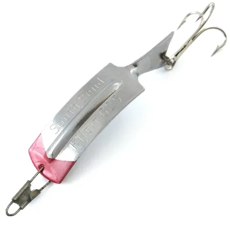 Značení „South Bend“ a „FLIPIT 625“ je jasně vyraženo do leštěného niklového povrchu a identifikuje tuto americkou klasiku z poloviny minulého století. Tento exemplář váží 8,5 g (1/3 oz), měří 6 cm (2 1/4") na délku a vyznačuje se výrazným červeným nátěrem na špičce, který tvoří ostrý kontrast k tělu ve stříbrném tónu. Tato konkrétní nástraha, katalogizovaná pod produktovým kódem 5520, je příkladem funkčního zpracování kovu typického pro výrobu South Bend v USA. Konstrukce se skládá ze zakřiveného kovového plátu zakončeného vyvýšenou ocasní ploutví, ke které je pomocí pevného spojovacího bodu připevněn stříbrný trojháček. Na přední hraně je drátěné očko s karabinkou ve vintage stylu pro bezpečné upevnění. Stav je hodnocen 5/5, nástraha má jasný, reflexní povrch a dobře zachovaný nátěr. Geometrie série Flipit byla navržena speciálně pro nahazování a trolling, přičemž využívá zatížený střed a unikátní rozšíření ocasu k udržení stability při přitahování vodním sloupcem.