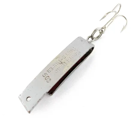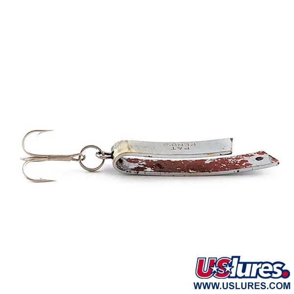 Na kovovém těle je jasně vyražen nápis „SOUTH BEND SUPER-DUPER 503“, což označuje design, který se stal nezbytnou součástí výbavy amerických pstruhařů. Specifické zahnutí této 3,5 cm (1 1/2") kovové nástrahy do tvaru písmene U je navrženo tak, aby kladlo odpor vodě způsobem, který zvládne jen málokterá jiná plandavka, díky čemuž je spolehlivou volbou pro nahazování i trolling na jemném vlasci. Tento exemplář má klasickou niklovou povrchovou úpravu s červeným vnitřkem, ačkoli část červené barvy se léty používání na spodní náběžné hraně ošoupala. Na horním ohybu zůstává označení „PAT PEND'G“ stále ostré a čitelné, což je malý pohled do éry, kdy South Bend poprvé uváděl tuto netradiční siluetu na trh. S hmotností 4,3 g (1/8 oz) zůstává univerzálním nástrojem pro lov pstruhů, okounů a štik. Osazení je jednoduché, obsahuje jeden kroužek, který drží ostrý trojháček na zadním konci ohybu. Tento kus je ve stavu 4/5, s čistým niklováním a velmi dobře čitelným továrním značením.