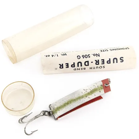 S hmotností 1/4 oz (7 g) se tento model řadí mezi nástrahy velikosti pro přívlač, vyvážené pro techniky lehké přívlače. Kovové tělo má stříbrný povrch se šupinovým vzorem doplněný o výrazný zeleně tečkovaný pruh, zatímco vnitřní ohyb odhaluje sytě červený povrch. Unikátní konstrukce modelu South Bend Super-Duper 506 ve tvaru písmene U o délce 4,5 cm představuje fascinující ukázku minimalistického inženýrství poloviny minulého století. Tento konkrétní kus s produktovým kódem 22994 nebyl nikdy použit a zůstává v původním stavu. Je dodáván v původním průhledném plastovém tubusu s papírovým letákem, který uvádí údaje o distribuci společností Campbell of Canada z Willowdale v Ontariu. Výbavu tvoří jeden trojháček připevněný pomocí kroužku k zadní části ohýbaného kovového rámu.