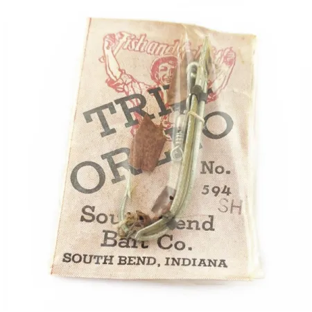 Tato prohnutá kovová nástraha Trix-Oreno 594 o délce přesně 4,5 cm dokládá řemeslnou zručnost společnosti South Bend Bait Co. ze 40. let 20. století. Exemplář o hmotnosti 2 g nebyl nikdy použit a je uchován v původním pergamenu s charakteristickou grafikou „Fish and Feel Fit“. Stříbrno-červené barevné provedení doplňuje štíhlý tvar plandavky určené pro muškařské pruty, nesoucí produktový kód 24176. Na zadní straně karty najdete instrukce vysvětlující, že model č. 594 má při klesání kmitat, čímž napodobuje živý hmyz. Výbava zahrnuje malý obratlík a jednoháček – tato konfigurace je navržena tak, aby ve srovnání s běžnými rotačkami méně zatěžovala muškařský prut. Sběratele potěší ostrá typografie s označením South Bend, Indiana, a specifické číslování modelu, který patří do širší rodiny nástrah Oreno. Nástraha si zachovává svůj původní povrch, což odráží kvalitu materiálů používaných značkou South Bend v této éře americké výroby rybářského náčiní.