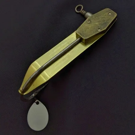 Ražba na kovovém těle se zlatou povrchovou úpravou identifikuje tento exemplář jako TRIX-ORENO č. 596, vintage nástrahu pro muškaření, kterou vyrobila firma South Bend ve 40. letech 20. století. S váhou 21 g (3/4 oz) a délkou 8 cm (3 1/4") umožňuje její speciální konstrukce třepotavý pohyb připomínající hmyz při propadávání vodním sloupcem. Tento konkrétní kus je osazen jednoháčkem, u jehož očka je umístěna malá stříbrná rotační lístek ve tvaru kapky, navržená pro zvýšení odlesků k nalákání ryb v hlubokých a temných tůních. Konstrukce zahrnuje drátěný chránič proti váznutí a integrovaný obratlík v místě navázání pro celkovou stabilitu. Stav je hodnocen jako 4/5, přičemž kovový povrch si zachovává jasně čitelnou ražbu a výrazný lesk. Společnost South Bend navrhla tento model tak, aby byl dostatečně lehký pro použití s muškařským prutem a při jemné práci špičkou věrně napodoboval pohyb plovoucí drobné rybky.