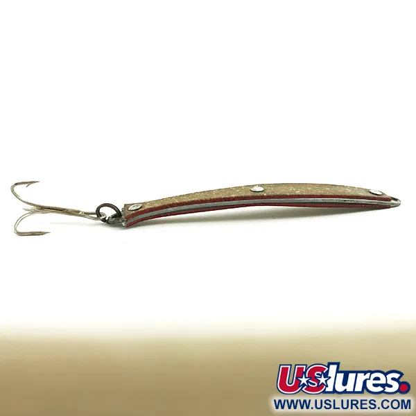 Tato vintage plandavka o hmotnosti přesně 1/2 unce (14 g) se vyznačuje vrstveným provedením a třpytivým povrchem se zlatými flitry. Sparky Jr. Spoon Sparkling Minnow s kódem 5751 představuje americký design z roku 1951. Podél okrajů vytváří sytě červený odstín dvoubarevný efekt na strukturovaném zlatém těle, které je zpevněno třemi výraznými stříbrnými nýty. Autentická ražba "SPARKY JR" je vtištěna přímo do materiálu a zůstává pod povrchovou úpravou jasně čitelná. Exemplář o délce 3 1/2" (9 cm) je ve stavu 5/5, s velmi zachovalým exteriérem a lesklým hardwarem. Na konci je osazen klasický trojhák, vhodný pro přívlač i trolling.