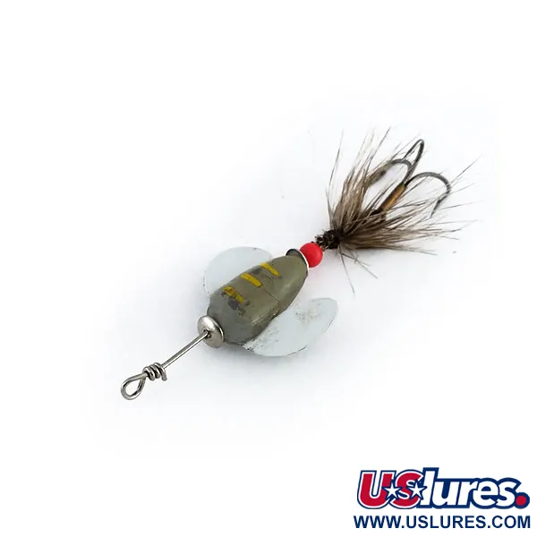 Tento opeřený Spin-n-Glo měří 5 cm od očka k obloučku háčku a nese nezaměnitelnou siluetu Yakima Bait. Šedé tělo je doplněno třemi žlutými pruhy a bílými křídly, což je kombinace navržená pro dobrou viditelnost v různých podmínkách na řece. Při hmotnosti 0,6 g (1/64 oz) obsahuje tento v USA vyrobený exemplář jasně červený korálek, který slouží jako distanční prvek a bod zájmu proti opeřené zadní části. Tělo vykazuje mírné známky předchozího používání s jemným opotřebením povrchu, což mu dodává autentický, v terénu prověřený charakter (3,5/5). Opeřený trojháček zůstává dobře zachovalý a dodává sestavě přirozenou texturu. Tento model, katalogizovaný pod kódem 9946, spoléhá na vzplývavost těla a rotaci křídel při umístění v proudící vodě.