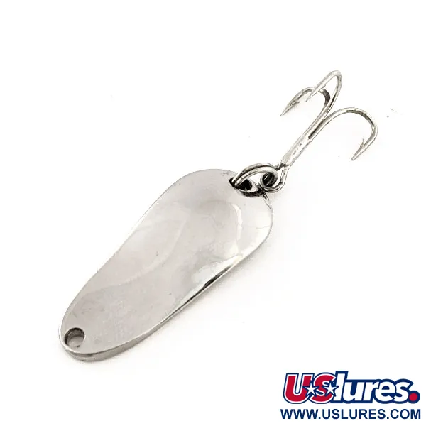Niklovaný povrch odráží světlo na štíhlém, kapkovitém těle této 3,5cm (1 1/2") plandavky. Na zadní straně je jasně vyraženo označení „Spinno-King No 00“, což je charakteristický znak společnosti Pecos River Tackle Co. z Nového Mexika v USA. Plandavka váží 1/4 oz (7 g), má pevnou kovovou konstrukci a udržuje si lesklý, reflexní povrch. Tento konkrétní kus, označený produktovým kódem 11360, vykazuje výjimečnou péči s hodnocením stavu 5/5. Součástí výbavy je robustní kroužek v zadní části spojující ostrý trojháček, zatímco otvor v zúžené přední části slouží k navázání vlasce.