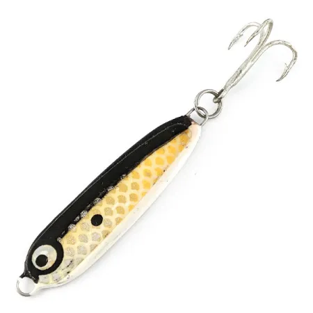Tato v USA vyrobená plandavka o hmotnosti 19 g (2/3 oz) představuje klasickou ukázku funkčního designu značky Stinger. Tělo o délce 5,5 cm (2 1/4") se vyznačuje výrazným černo-bílým podkladem, který ve střední části doplňuje nápadný vzor včelí plástve v teplém žluto-zlatém odstínu. Hned za velkým okem se nachází jasný černý bod, který napodobuje přirozený úderný bod (strike point) kořistní rybky. Tato nástraha s produktovým kódem 21478 má hydrodynamický profil určený pro daleké hody a prezentaci v hluboké vodě. Osazení je robustní a zahrnuje pevný kroužek spojený s ostrým trojháčkem, přičemž si celá nástraha zachovává mimořádně čistý povrch. Nález tohoto exempláře v tak zachovalém stavu – hodnoceném 5/5 – podtrhuje kvalitu těchto vintage nástrah. Oko na přední části je vyvedeno v černé a bílé barvě, což dodává na realismu tmavému hřbetu, který ostře kontrastuje s leštěným stříbrným břichem.