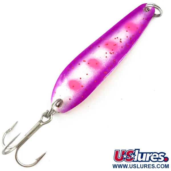 Tato 5g (3/16oz) trollingová plandavka od Advance Tackle se vyznačuje klasickým tepaným měděným povrchem na zadní straně. Přední strana přechází z výrazných fialových okrajů do čistě bílého středu, doplněného čtyřmi zřetelnými růžovými tečkami a jemným popraškem červených třpytek. Tato v USA vyrobená plandavka Stinger Scorpio (kód produktu 4282) měří 5,5 cm (2 1/4") a její název spolu s původem v Michiganu je vyražen přímo do měděného pokovení s voštinovým vzorem. Tento konkrétní kus je ve stavu 5/5, přičemž si zachovává plný lesk na kovové straně a ostré detaily na straně lakované. Osazení zahrnuje ostrý trojháček a dva pojistné kroužky, optimalizované pro trolling, kde je nejúčinnější kontrast mezi vysoce viditelným nátěrem a hřejivým odleskem mědi. Úzký, protáhlý profil je charakteristický pro designy z oblasti Velkých jezer z konce 20. století, určené k lovu pstruhů a lososů.