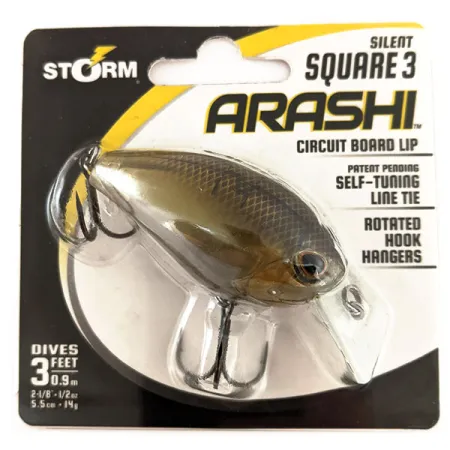 Barevné provedení Ghost Hitch dodává tomuto 5,5 cm (2 1/4") crankbeitu decentní, poloprůsvitný profil vhodný do čistých vod. Storm Arashi Silent Square 3 o hmotnosti 14 g (1/2 oz) je vybaven tenkou lopatkou z plošného spoje (circuit board), která mu umožňuje rychle dosáhnout pracovní hloubky 0,9 m (3 ft). Tento kus s produktovým kódem 11676 je nepoužitý v originálním balení. Konstrukce obsahuje samoseřizovací očko pro vlasec (self-tuning line tie), což je pohyblivý prvek navržený tak, aby nástraha držela přímý směr i po nárazu do překážky. Pro efektivní zásek jsou v designu použita otočená očka pro háčky, která drží háčky VMC blízko těla, což umožňuje použití větších velikostí bez rizika zamotání. Vyrobeno v Indonésii, tichý design nástrahy je přizpůsoben pro opatrné ryby pod tlakem.