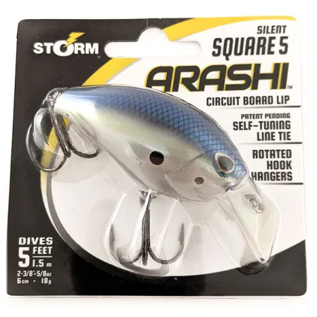 Tělo o hmotnosti 18 g (5/8 oz) má modře šupinatý hřbet, který přechází do stříbrno-bílých boků s výraznou tmavou skvrnou. Storm Arashi Silent Square 5, kód produktu 11951, měří 6 cm (2-3/8") a je vybaven tenkou lopatkou z plošného spoje pro dosažení hloubky 1,5 m (5 ft). Tento tichý crankbait využívá samonastavovací očko, volně pohyblivou konstrukci určenou k udržení přímého chodu během navíjení. Pro lepší výkon v překážkách umožňují otočená očka háčků, aby VMC háčky zůstaly blízko profilu nástrahy, čímž se snižuje riziko uváznutí. Nástraha vyrobená v Indonésii nabízí valivý pohyb s výrazným kopáním ocasu. Tento konkrétní kus je nepoužitý a je hodnocen stupněm 6.