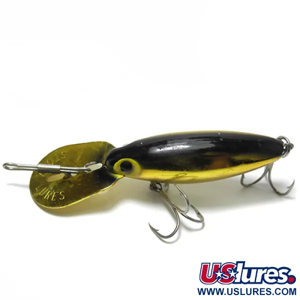 Zlaté metalické pokovení dodává tomuto 5cm vintažnímu úlovku nadčasový vzhled, zejména v kombinaci s vysoce kontrastním černým pruhem na hřbetu. Tento Storm Hot'N Tot, označený kódem 0104, reprezentuje řemeslné zpracování série Thin Fin, původně vyráběné v USA. S hmotností 6,5 g je wobler vybaven charakteristickou kovovou lopatkou navrženou pro stabilitu při trollingu nebo driftování v různých proudech. Žluté oči s výraznými černými zorničkami tvoří jasný ohniskový bod na reflexním zlatém těle. Trojháčky i uchycení lopatky jsou vyrobeny z odolných materiálů, což odpovídá stavu 4/5 tohoto kusu. Zatímco mnoho pozdějších modelů přešlo na plastové komponenty, integrovaná kovová lopatka na tomto exempláři zůstává oblíbenou volbou pro sběratele, kteří oceňují tradiční provedení a specifické vlastnosti chodu.