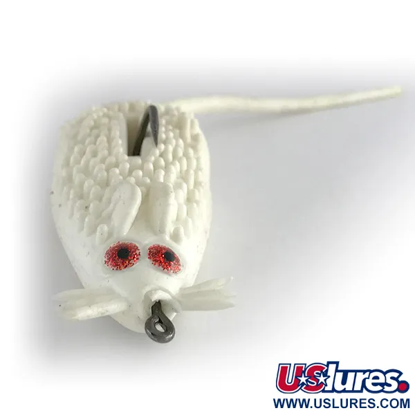 Zářivě bílá povrchová úprava pokrývá strukturované, hrbolaté tělo tohoto klasického hladinového hlodavce, což mu pomáhá vyniknout v husté vegetaci. Tento Strike King King Rat pochází z USA a pod produktovým kódem 8065 představuje typickou éru nezávadného (weedless) designu pro lov v hustém krytu. Měkké tělo je osazeno jednoháčkem směřujícím nahoru, který je chráněn hlubokou drážkou podél hřbetu, aby se zabránilo uváznutí. Třpytivé červené oči poskytují jasný vizuální cíl, zatímco integrované vousy a dlouhý ocas dotvářejí profil nástrahy. S hmotností 1/2oz (14g) a délkou 2 1/4" (6cm) je poměr váhy a velikosti vyvážen pro nahazování do leknínů, kde se často skrývají štiky a okouni. Tento konkrétní exemplář je ve vynikajícím stavu, hodnocen 5/5, přičemž bílé zbarvení i pružné komponenty zůstaly pozoruhodně zachovalé. Očko pro navázání vlasce je umístěno přímo na nose pro přímé a konzistentní vedení skrze nejhustší porosty.