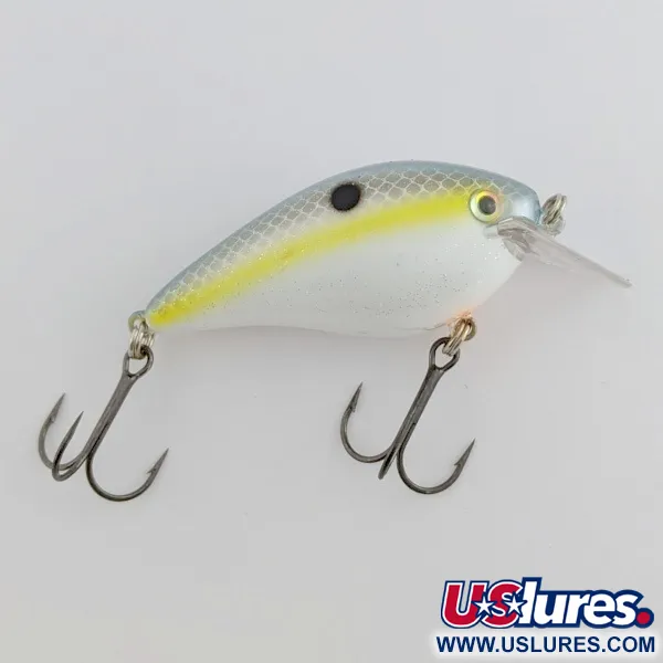 Hranatá lopatka z čirého plastu definuje profil wobleru Strike King KVD 1.5 Silent square bill, navrženého speciálně pro procházení hustými vázkami. Tento model s produktovým kódem 24437 je vyveden v ikonickém vzoru Sexy Shad, který se vyznačuje lesklým modrošedým šupinatým hřbetem a výraznou žlutou postranní čárou. Charakteristická černá tečka na boku a jemný oranžový akcent na břiše slouží jako klasické vizuální spouštěče pro tuto barevnou variantu. Jakožto model Silent postrádá vnitřní chrastítka, což nabízí přirozenější prezentaci při nahazování nebo trollingu v revírech pod velkým rybářským tlakem. Nástraha váží 3/8 oz (10,6 g) a měří 2 1/2 palce (63,5 mm). Je konstruována pro dosažení hloubek mezi 0,9–1,5 m. Výbava zahrnuje dva ostré trojháčky v tmavé povrchové úpravě. Tento wobler je ve vynikajícím stavu, s hodnocením 5/5 za čistý povrch a velmi zachovalý vzhled.
