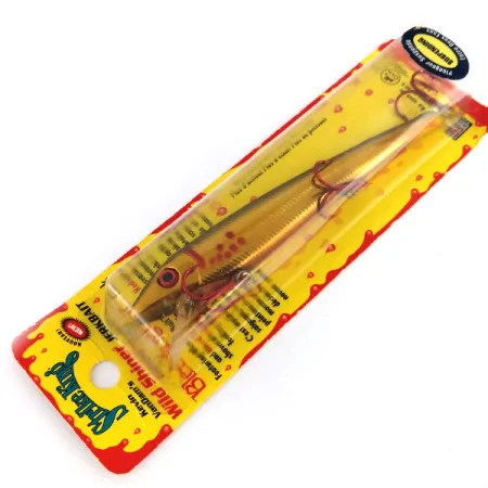 Zlatá povrchová úprava, jako má tento Strike King Wild Shiner, byla navržena tak, aby efektivně odrážela světlo a vytvářela odlesky v různých světelných podmínkách. Tento 12 cm (4 3/4") jerkbait je součástí signované série Kevina VanDama, nese produktový kód 9918 a označení BBWSS-396 na zadní straně. Je vybaven výraznými červenými trojháčky „Bleeding Bait“, což je technický detail simulující zraněnou kořist. S hmotností 17 g (3/5 oz) je nástraha konstruována jako vznášivý (suspending) model, který během pauzy zůstává stát ve vodním sloupci. Při nahazování se hloubka ponoru pohybuje od 0,3 m do 2 m (1ft až 6.5ft), zatímco při trollingu může dosáhnout hloubky 3 m až 4 m (10ft až 13ft). Tento kus je nepoužitý, uchovaný v původním obalu z výroby v Mexiku. Štíhlý profil a detailní vzor šupin zůstávají ostré a nepoškozené.