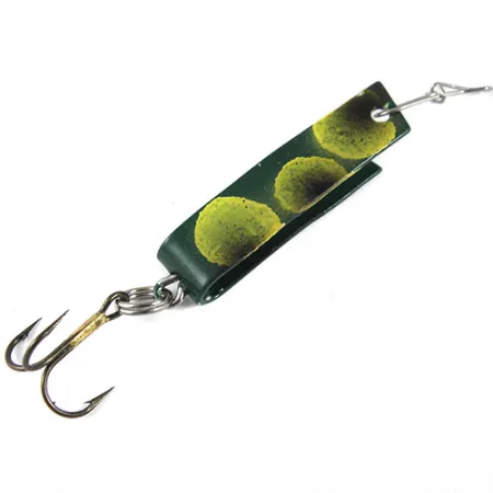 Žluté tečky na sytě lesním zeleném podkladu charakterizují vzor Frog této 3 cm (1 1/4") nástrahy Super-Duper 501 od South Bend. Původně vyrobeno v USA, tento konkrétní model (kód produktu 0896) vykazuje klasický design z ohýbaného kovu ve tvaru písmene U, který je po desetiletí základem rybářských boxů. Při hmotnosti jemných 2,3 g (3/32 oz) je nástraha vybavena ostrým trojháčkem připojeným robustním kroužkem a drátěnou karabinkou u úchytu šňůry. Vnitřní křivka kovového těla odhaluje celozelený povrch se žlutým nápisem, což udržuje čistý vzhled odpovídající hodnocení stavu 5/5. Nanášení barvy na ohýbané kovové tělo je typické pro výrobu South Bend z poloviny století, určené pro přívlač nebo trolling v lehkých rybolovných situacích.