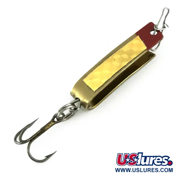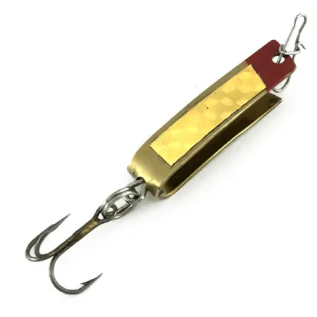 Pozlacený povrch a zářivě červená špička definují vizuální charakter nástrahy South Bend Super-Duper 501, která je vedena pod produktovým kódem 9537. Tato v USA vyrobená nástraha o hmotnosti 3/32 oz (2,3 g) a délce 1 1/4" (3 cm) se vyznačuje specifickou konstrukcí z kovu ohýbaného do tvaru U. Na jedné straně je aplikován texturovaný holografický zlatý pásek pro zvýšení odlesků světla. Tento exemplář je ve stavu 5/5 a vykazuje čistý povrch, do kterého je zřetelně vyražena značka 'SUPER-DUPER'. Výbava zahrnuje robustní trojháček připevněný přes kroužek a drátěný obratlík s karabinkou pro snadné připojení vlasce u hlavy. Celkový design představuje unikátní spojení prvků plandavky a rotační třpytky, což je charakteristické pro výrobní postupy South Bend z poloviny minulého století.